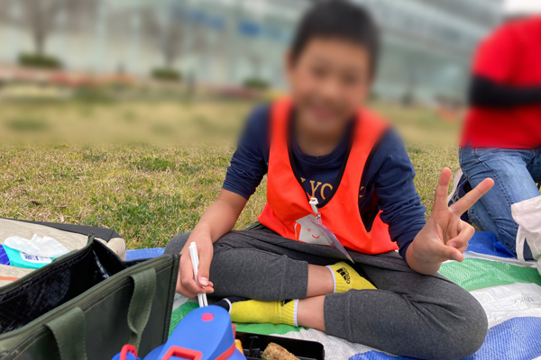 春らしく過ごしやすい気候の中、お友だちやチューターと一緒にピクニック気分で食べるお弁当は格別だったようで、笑顔いっぱいの子どもたち。