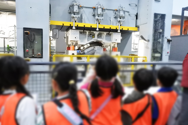 ロボットが車を組み立てる様子を興味津々で見つめる子どもたち。