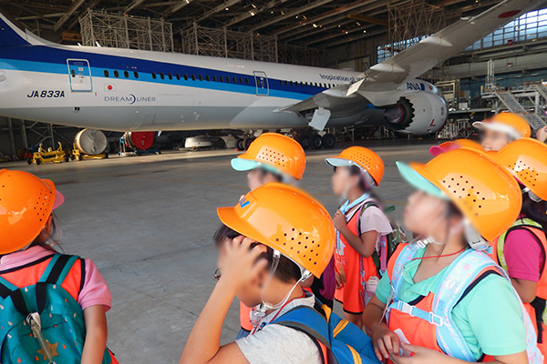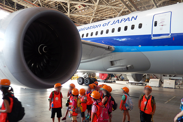 その後、3班に分かれヘルメットをかぶり格納庫の中で飛行機を見学。