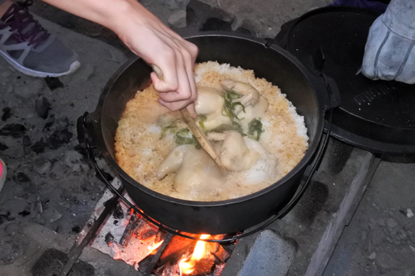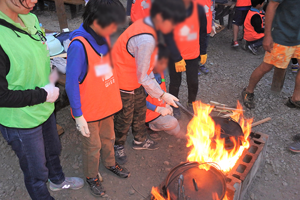 かまどとダッチオーブンを使い、調理をしました。火おこしや調理器具の準備、炊飯から配膳まですべて子どもたち主導で行いました。